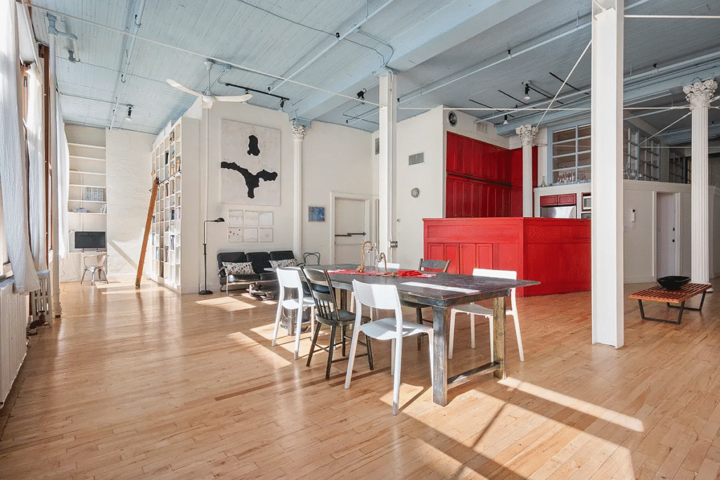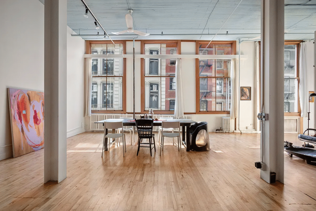 Our sun-drenched Soho loft embodies downtown Manhattan’s creative spirit. Oversized windows bathe the space in natural light, illuminating original hardwood floors and exposed ceilings that honor the neighborhood’s artistic heritage. Unique neutral tones provide a sophisticated canvas, punctuated by a bold pop of color in the kitchen. Eclectic furnishings and curated artwork create an inspiring yet comfortable environment with ample space to bring your project to life.